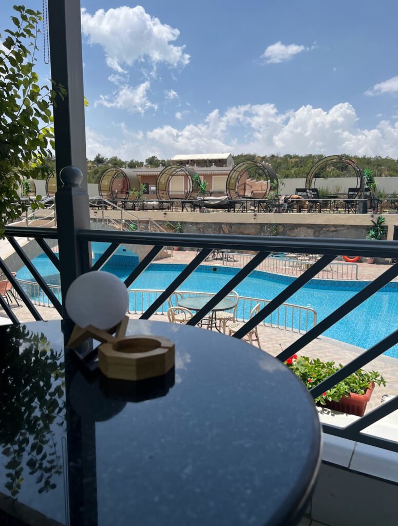 الموقع ككل منتجع وداخله مقهى..المكان لطيف ونظيف و الأجواء عليلة..الكافيه مطل على المسبح وفيه ألعاب مائية للأطفال ومسار دراجات..بالنسبة للطعام طلبت وافل وكراوسون و بان كيك..الوافل لذيذ ومقرمش..البان كيك عادي والكرواسون عجينته سيئة ومزيت.. بالنسبة للمشروبات طلبنا فلات وايت وموكا وموهيتو..الموكا عادية والفلات وايت طلبنا الحليب يكون ستاندرد وجانا يغلي..😅 بس المشرف ما قصر سمع الملاحظة وعرض يبدله بواحد جديد وفعلا ً الباريستا الأساسي هو اللي صلحه وجانا يعتذر عن الخطأ وكان محترم جداً وفعلا كان الفلات هالمرة جيد ..