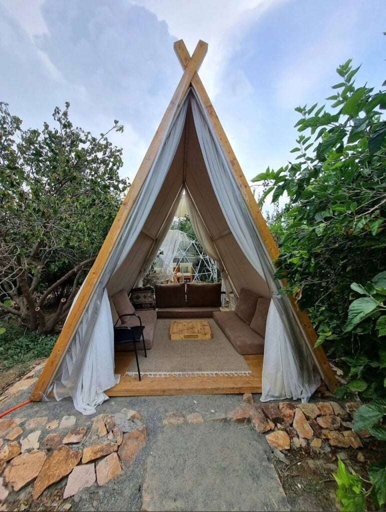 – جلسات أرضية داخل خيمة ريفية، وكراسي وطاولات داخل قبب بانورامية